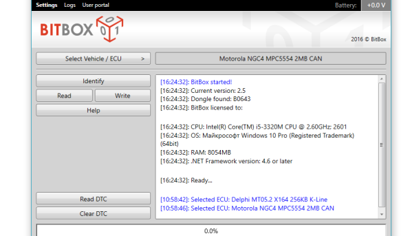 BitBox is a flasher that allows identification, reading and writing of ECU internal flash memory for various purposes. It works via CAN bus or K-line data interfaces using an J2534 Pass-thru adapter.