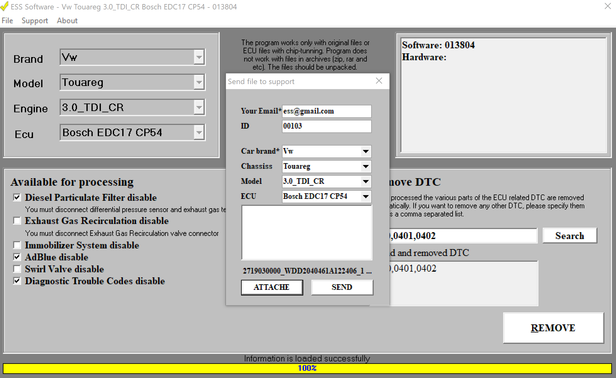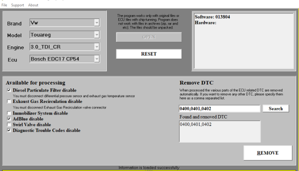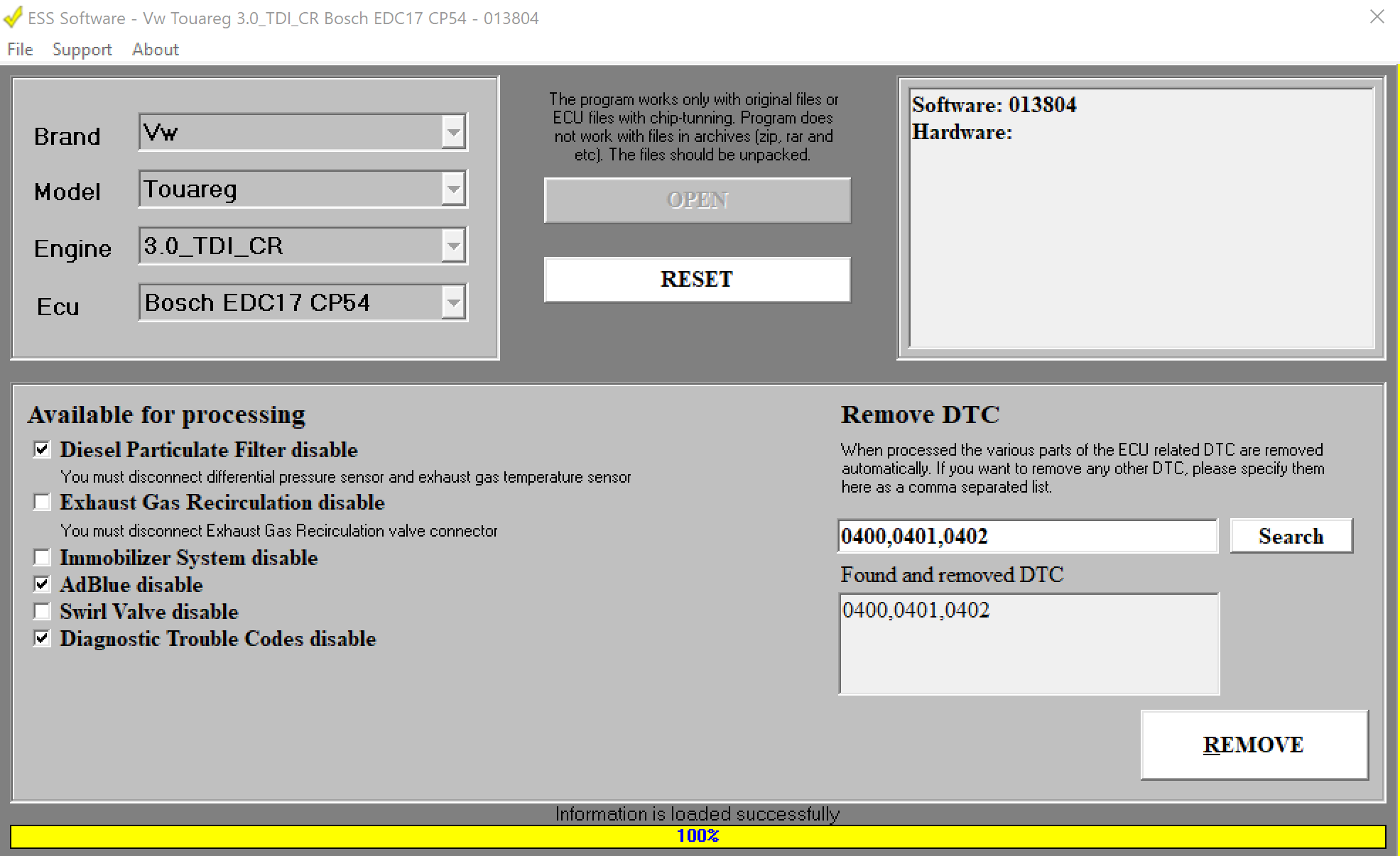 The software is marketed on a module basis (one module — one brand). It contains build-in tooltips on necessary additional actions when disabling some systems (e.g. required disabling of EGT and DP sensors when disabling DPF). Due to its high quality dump processing the ESS is used by professionals who are capable of developing solutions of system disabling themselves as ESS allows to do it fast and with guarantee.