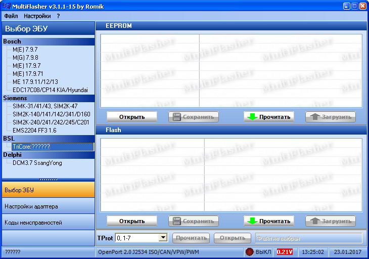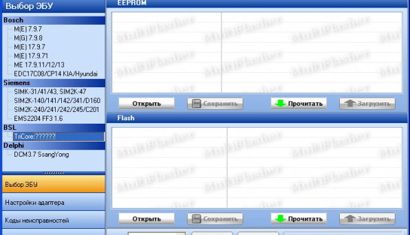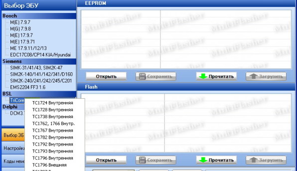 - BSL TriCore. Reading and flashing of ECU internal and external FLASH/EEPROM memory with Infineon TriCore TC1724, TC1728, TC1738, TC1762, TC1766, TC1767, TC1782, TC1792, TC1793, TC1796, TC1797 processors in BSL mode. The approximate short list of supported ECUs BOSCH M(E)17.9.7 (VAZ/UAZ), and ME17, ME (D, G)17, EDC17 (AMG, Audi, BMW, Citroen, Honda, Hyundai, KIA, Land Rover, Mercedes, Mini, Peugeot, Porsche, Renault, Saab, Skoda, Toyota, Volkswagen, Volvo).
