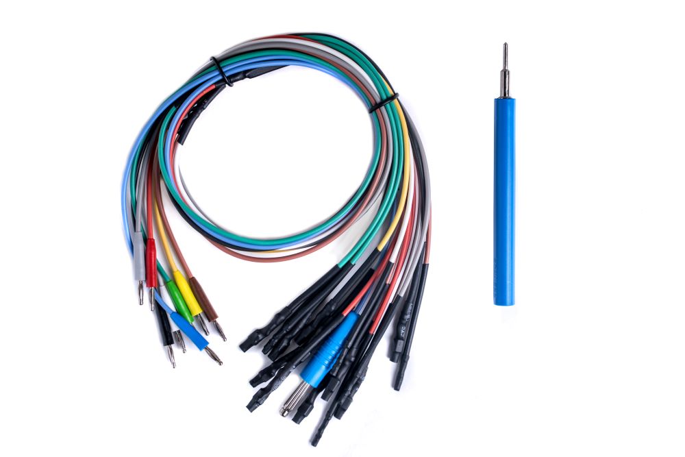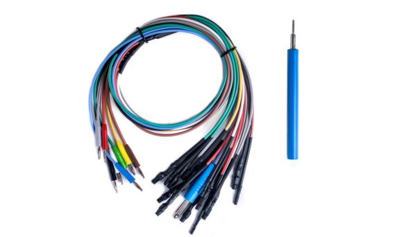 - Set of flexible banana cables and blue boot pen